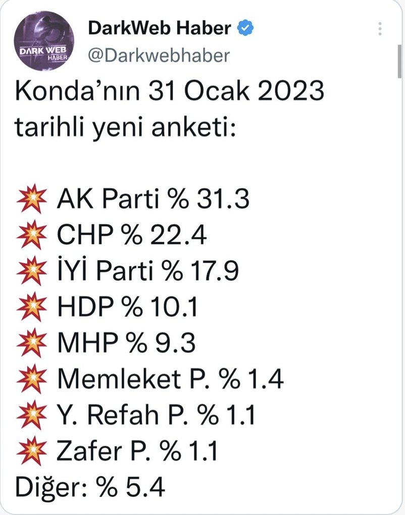 Gelin size İyi Parti'nin anketler üzerinden yaptığı algı çalışmasını anlatayım. İyi Parti bugün Darkweb isimli hesap üzerinden Konda'ya ait bir anket yayınlattı. Anket tamamen uydurma bir sonuç içeriyor. İyi Parti'ye imkansız bir oy oranı yazmışlar. Önce Konda'ya bir göz atalım.