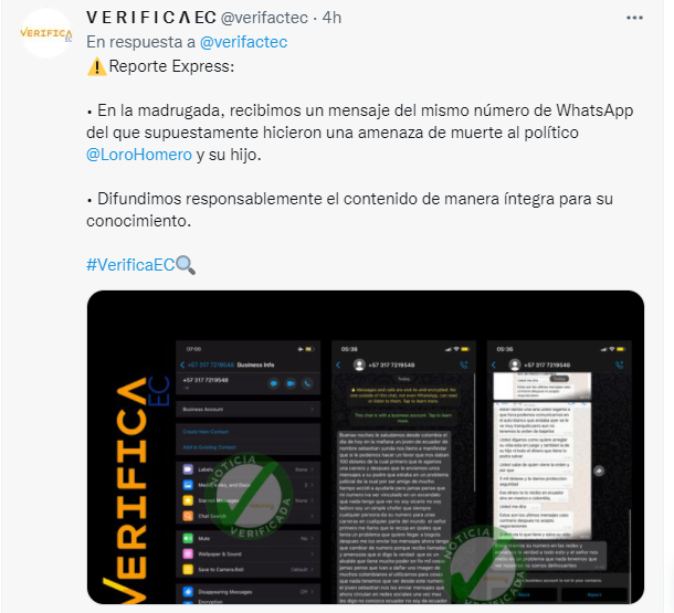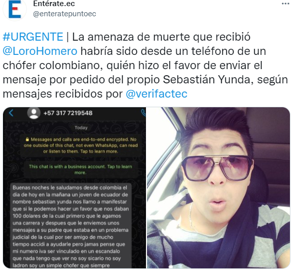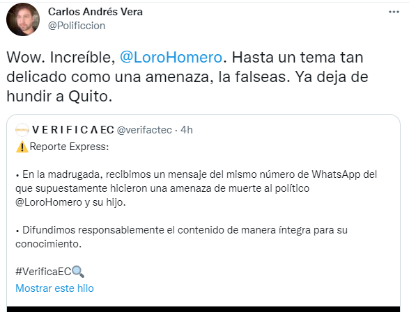 ¿Por qué esto en particular es inverificable? Principalmente porque dependemos de la palabra de ambos lados. Todavía no se ha informado que @LoroHomero haya puesto una denuncia por la amenaza que habría recibido. Lo mismo con @verifactec. Eso nos deja en una posición complicada.