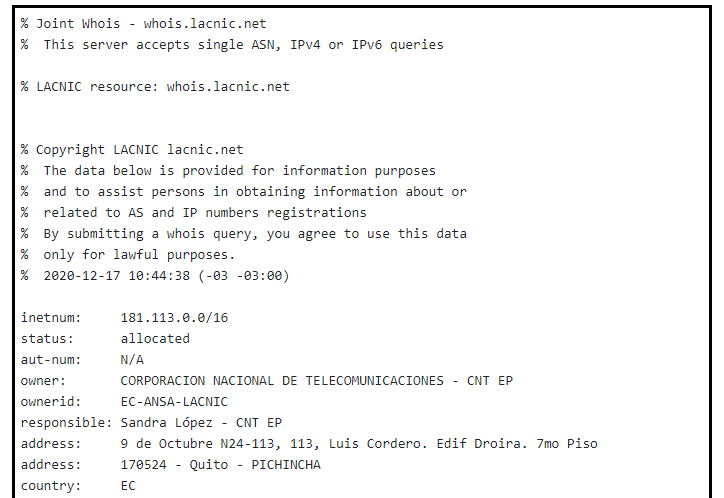 181.113.57.169: Es la IP pública de CNT. Encontrarla no es difícil. Hay motores de búsqueda whois que hacen un query con la IP o el nombre de la institución y los asocian. También se puede averiguar con Shodan, como señala @dieguitocazar en este artículo: labarraespaciadora.com/ddhh/la-tecnic…