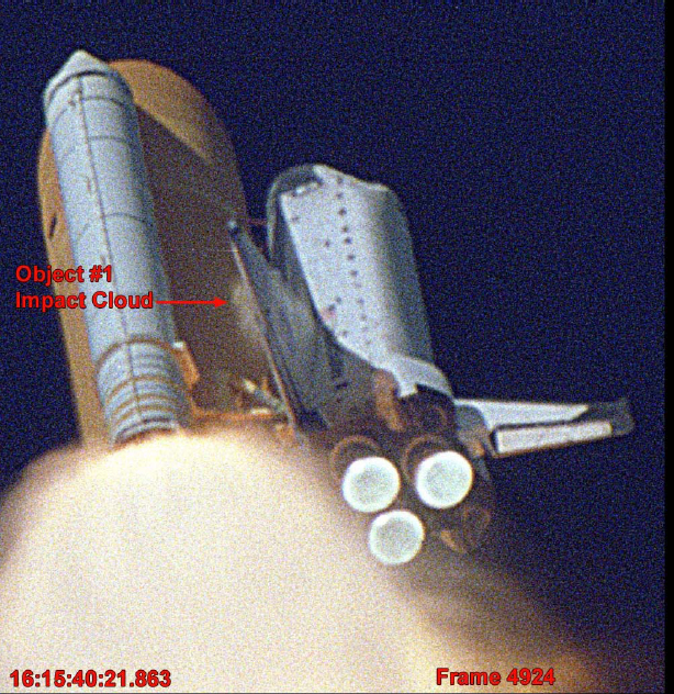 Мы уже знаем, что на 82 секунде от левой части верхнего крепления топливного бака отломился кусок изоляционной пены, который ударил по передней кромке левого крыла. Мало того, что точно такая же проблема была в 4 предыдущих полётах, но во время КАЖДОГО пуска по Шаттлу что-то било
