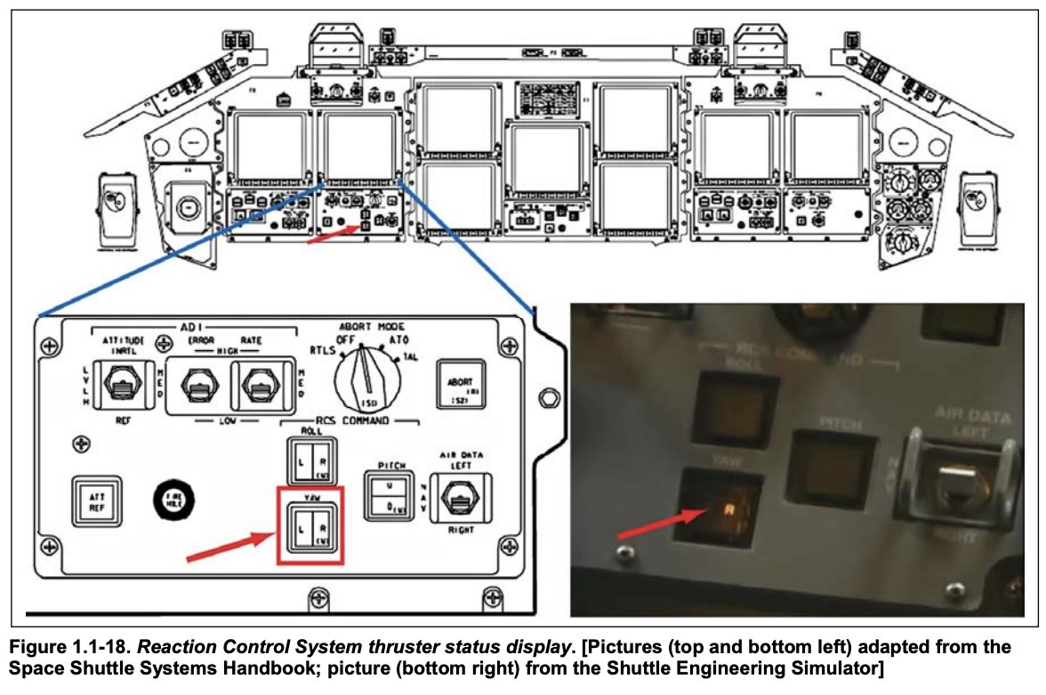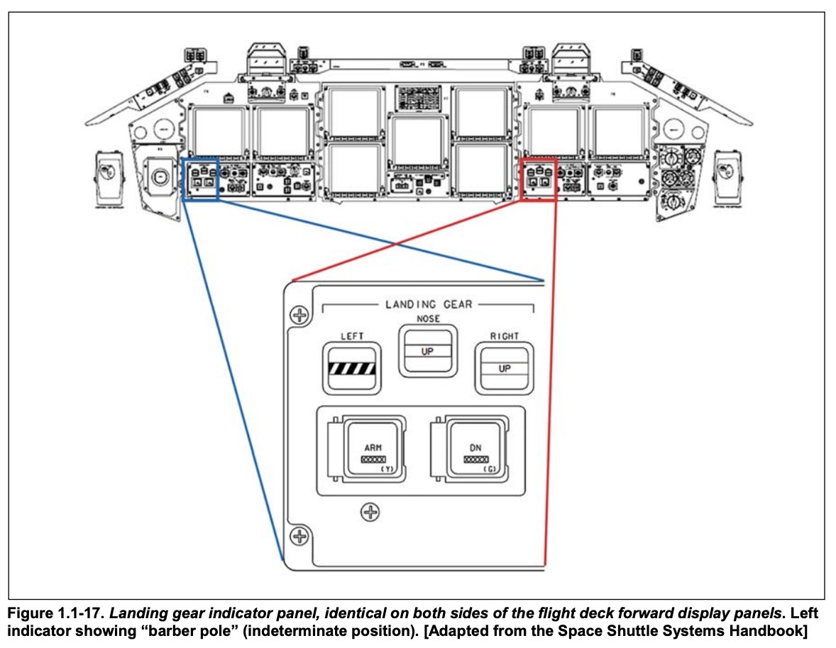В течение следующих 40 секунд ЦУП и экипаж получили предупреждение о непонятном статусе левого шасси. После срабатывают двигатели маневрирования для корректировки положения. Система не понимала данные с левого крыла, но продолжала корректировать нарастающую аномалию в траектории.