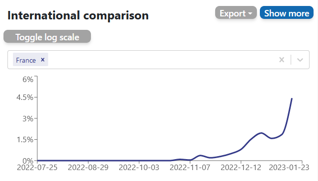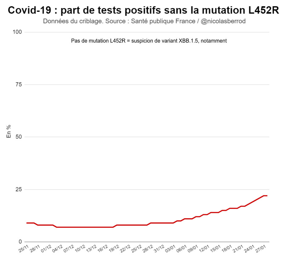 La part de tests positifs criblés sans la mutation L452R, pouvant correspondre notamment au variant #Omicron XBB.1.5 (mais pas seulement), grimpe progressivement depuis trois semaines et atteint désormais près de 25%. ⤵️
