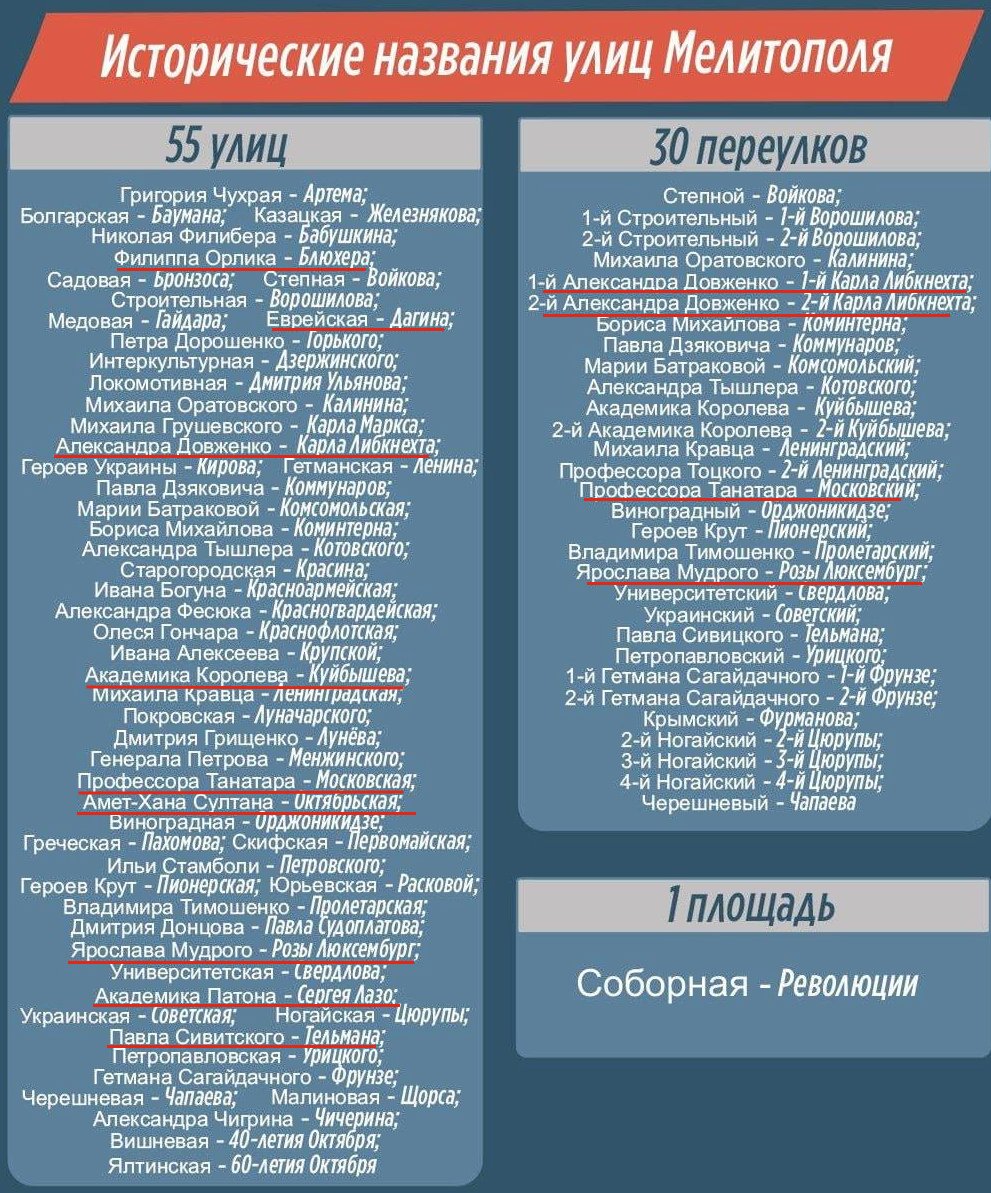 Here is the list. I marked some of changes to present the Russians' logic. It is clear, why they have renamed Pylyp Orlyk street - the auther of the first Ukrainian Constitution in 16th century. Now it is Blucher street, after a Soviet warlord in 1920s. But what about others? 2/x