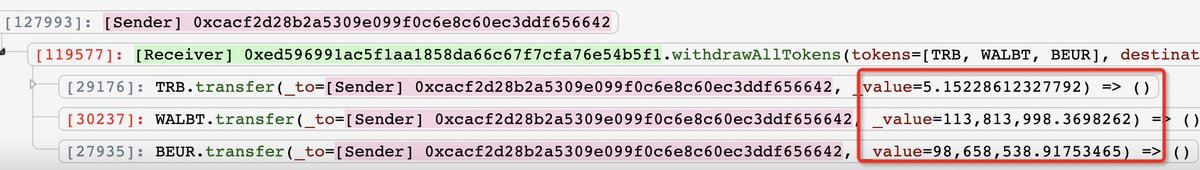The actor then walks away by withdrawing the illicit gains with 113.8M #WALBT and 98M #BEUR (valued >$10M). Some of these tokens are then dumped, resulting in major drop! #WALBT dropped by >50% and #BEUR dropped by 34%