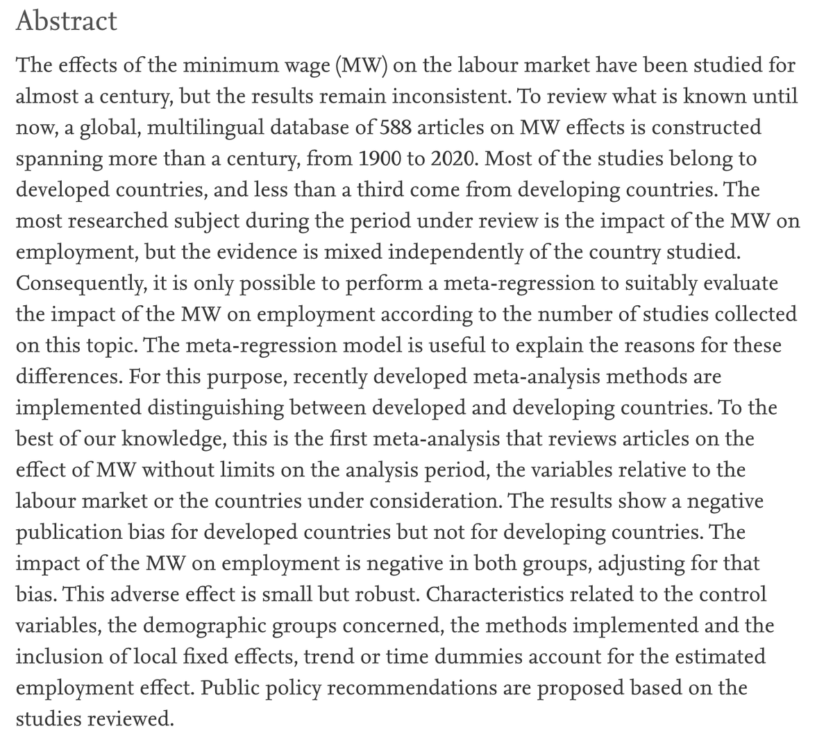 Un meta-análisis de 588 artículos, entre 1900-2020, sobre los efectos del Salario Mínimo en el empleo, concluye que: