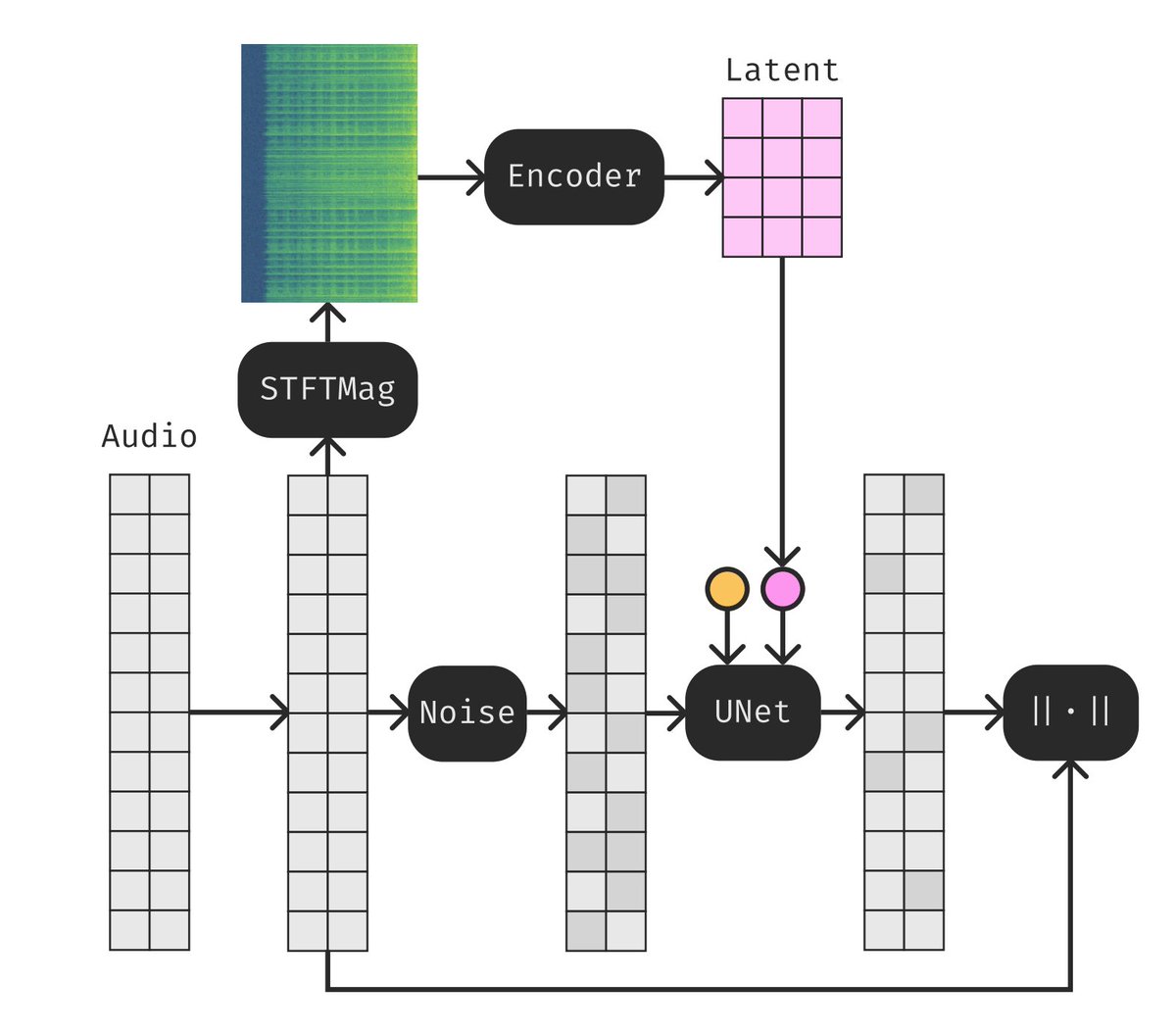 Moûsai, another text-to-music generative model that leverages latent diffusion. Yes, this is the same underlying technique as Stable Diffusion! Using latent diffusion is good for dealing with longer context while keeping efficiency. The neural workflow is as follows: