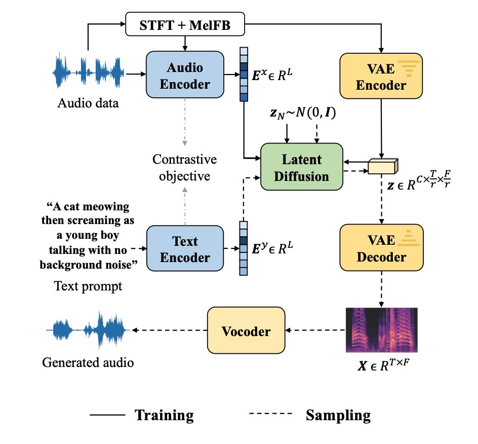 AudioLDM: also a latent diffusion model for audio generation. Similar to Google’s MusicLM, they train a CLIP-style, audio-text contrastive model called CLAP to provide high-quality embeddings.