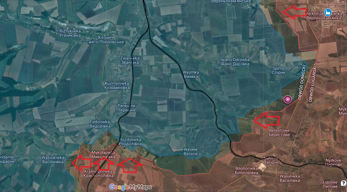 Spirne. RUS zdobyli wieś Mykołajiwka i szturmują Rozdoliwke i Fedoriwkę, gdzie sytuacja obrońców stała się ciężka. Siły RUS od Siewierska dzieli mniej niż 11 km. Prowadzone są również ataki w regionie wsi Spirne, które mają wiązać walką wojska ukraińskie. Nie jest dobrze. 4/