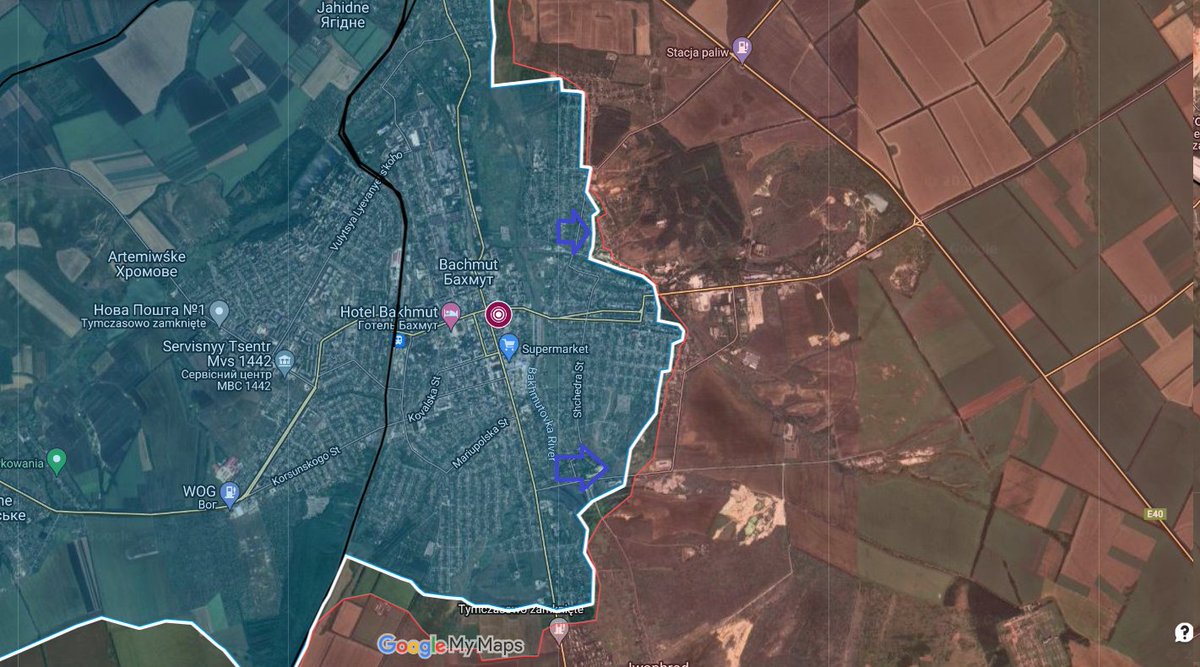 Bachmut. UA straciło obszar winnicy i zakładu produkującego wina. Była to istotna pozycja obronna. Trwa również mocny nacisk na północą część Bachmutu.