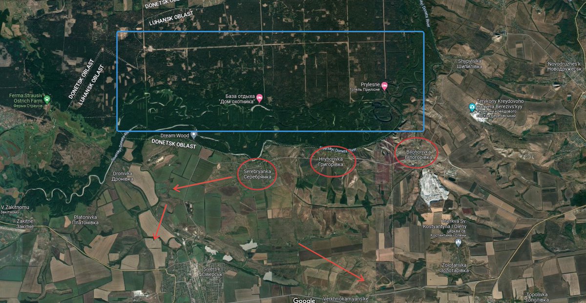 (see previous post), I believe the key to this particular section lies in the south, cutting off the access of UA forces across the Siverskyi Donets river. The length of forest belt with exposed flanks then becomes untannable, & UA forces must once again withdraw or face