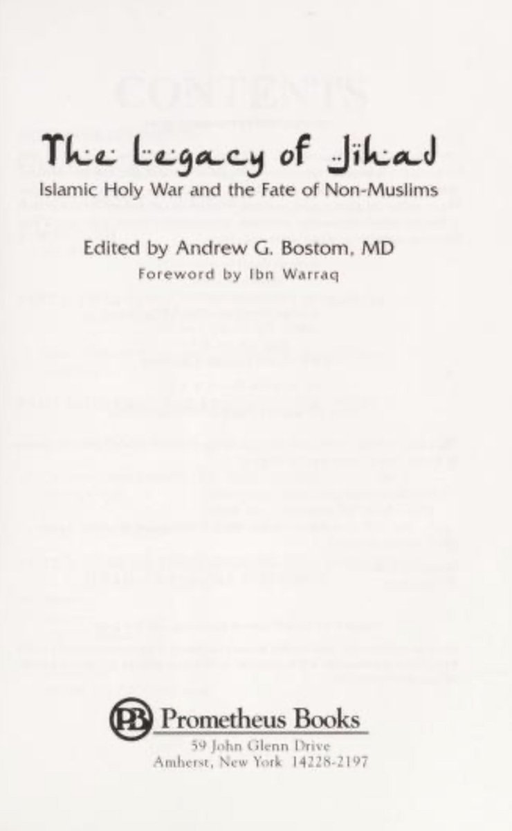 But Google does what Google does and the source finally appeared. It’s a 2005 work by American Jewish professor of medicine, Andrew Bostom. It’s titled “The Legacy of Jihad” and is foreworded by an anonymous critic of Islam who goes by the pseudonym Ibn Warraq.