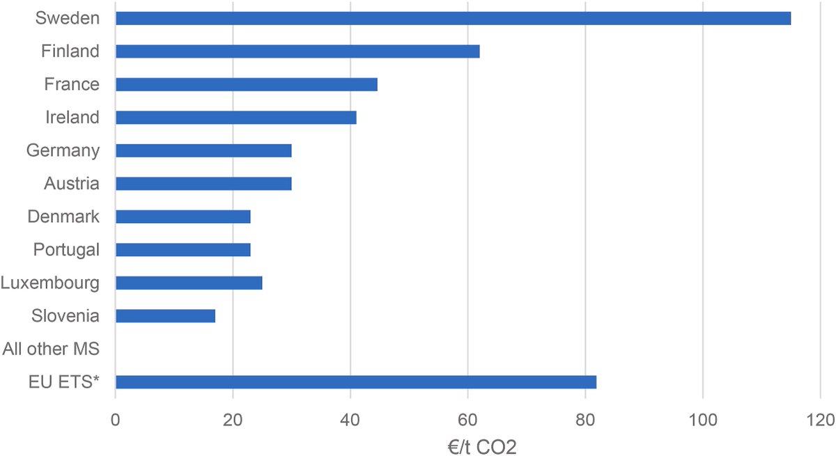 1/ To date, only 9 EU Member States have placed a carbon tax on fossil heating fuels. On the other hand, the EU ETS puts a carbon price of electricity. Even where carbon taxes on heating fuels are in place, ETS price is higher than carbon tax rate in all but 1 country.