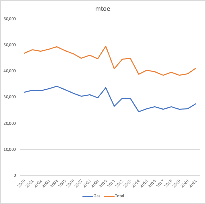 1/ Historic energy demand figures for the UK domestic sector show a clear downward trend in energy use. Data from @beisgovuk. This is despite a growing number of households, a rising population and growing floor area over that period.