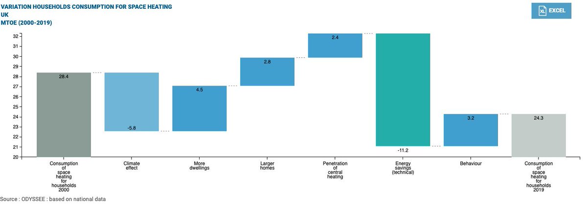2/ Decomposition analysis by Odyssee-Mure shows that the key driver of the reduction has been energy efficiency. This accounts for more homes, more floor area and the weather.