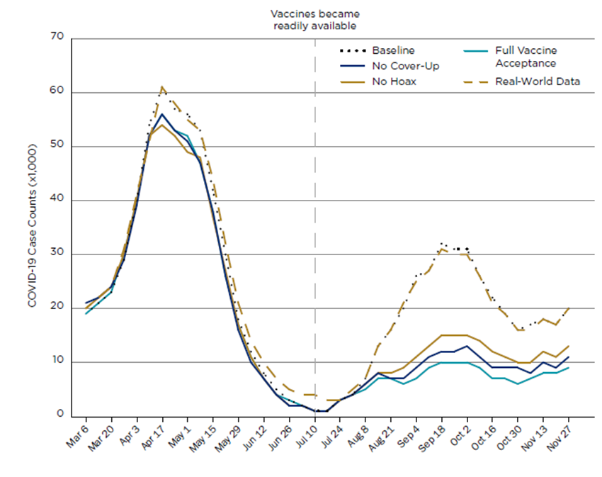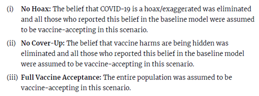 let's start with sourcing "2800 deaths". This figure appears in their Table 4.2, which stated that misinformation resulted in 8% fewer vaccinations, resulting in 2800 extra deaths (35% !) in period from Mar 1, 2021 to Nov 27, 2021. Compared to model.