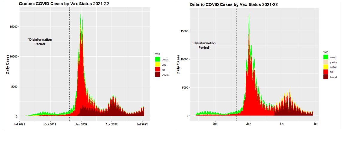 let's look at what Lewandowsky failed to show. Data below shows Ontario and Quebec case data by vax status from summer 2021 to July 2022 (when both provinces STOPPED this reporting.) From Dec 2021 on, overwhelmingly cases were fully vax and then boosted. Why didnt Lew show this?