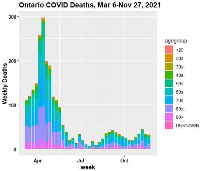 in period from July 1, 2021 to Nov 27, 2021, there were 550 COVID deaths in Ontario - which is ~40% of Canadian population. Not nearly enough to make Lewandowsky's claimed 2800, even if EVERY death was avoidable thru vaccination, which they werent