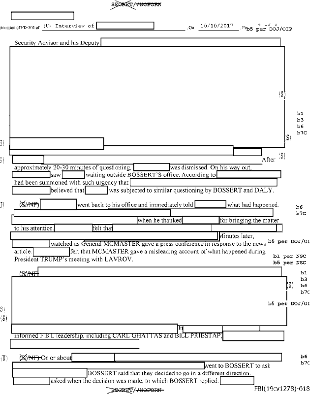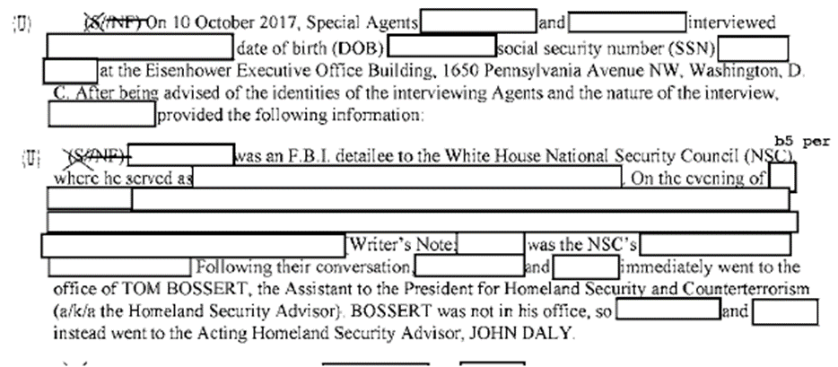 one of the very last Mueller 302s to be released (volume 13, pdf 18/duplicate pdf 36) describes an interview with a redacted FBI detailee to the NSC about his interactions with Tom Bossert and his deputy who were concerned about the latest (May 15, 2017) leak.