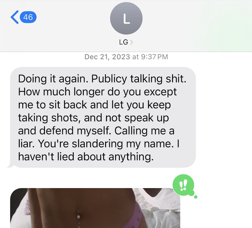 On December 21 I was doing my live show when she began rage texting me, accusing me of talking about her (I wasn’t, and had never mentioned her name on my show at that time). She then abruptly changed course, sending me sexual pictures of herself, calling me “Daddy,” asking me for gym pics, and then inviting me over to her apartment the next day after my arraignment for a threesome.