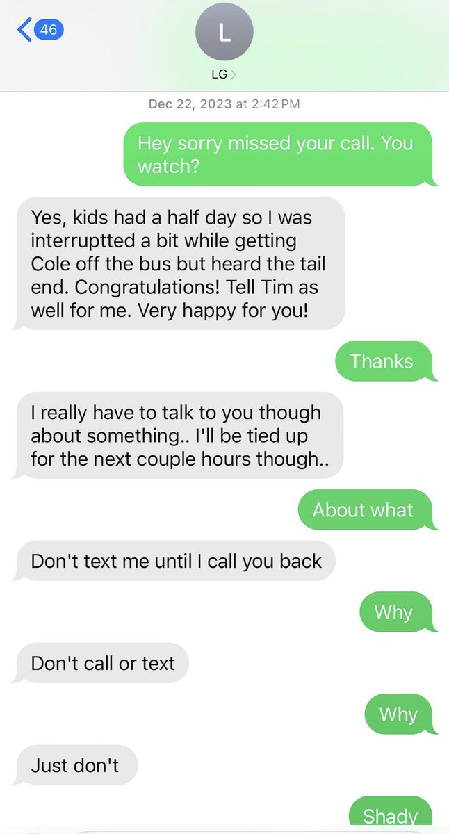 All of this can be proven to be untrue simply by reviewing screenshots of our conversation from December 21-23. Some of these are embarrassing for me to share, as they are private in nature and never intended to be seen by a larger audience. Unfortunately the Commonwealth has chosen to exploit a dangerous woman with a clear agenda to, in her own words, “fucking destroy” me, so sharing these messages is the only way I can defend myself.