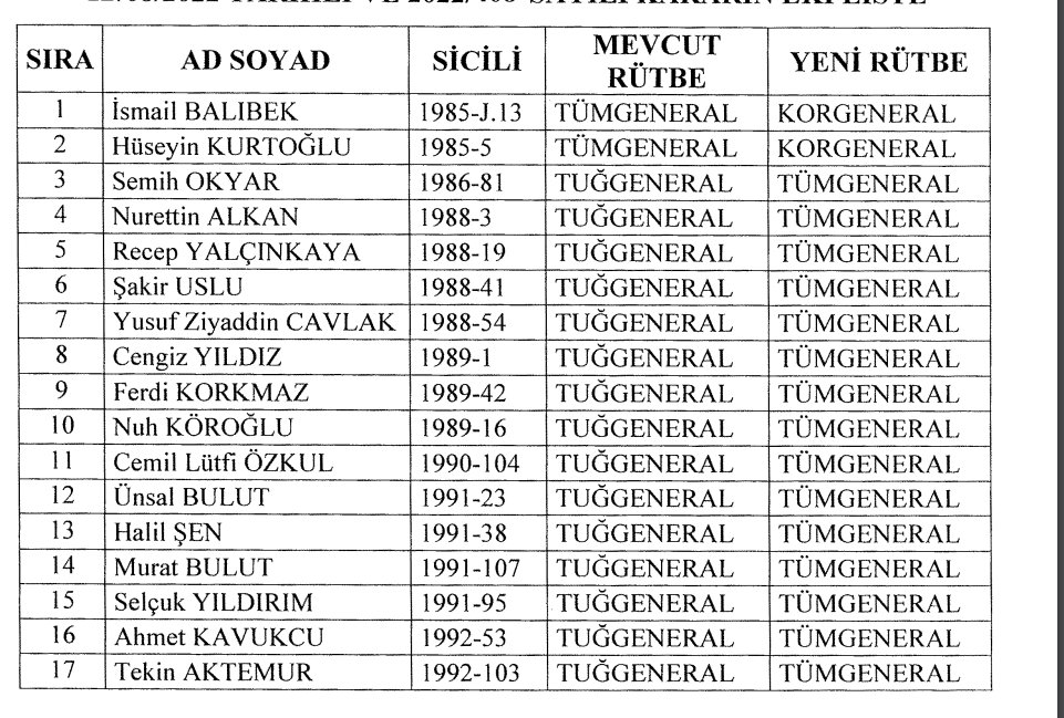 Jandarma Genel Komutanlığında bir üst rütbeye terfi eden general ve albaylar: (+)
