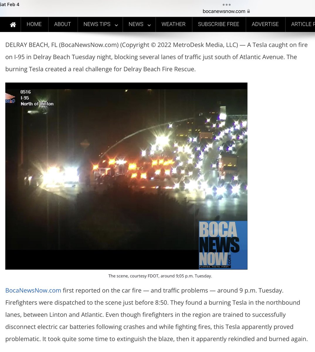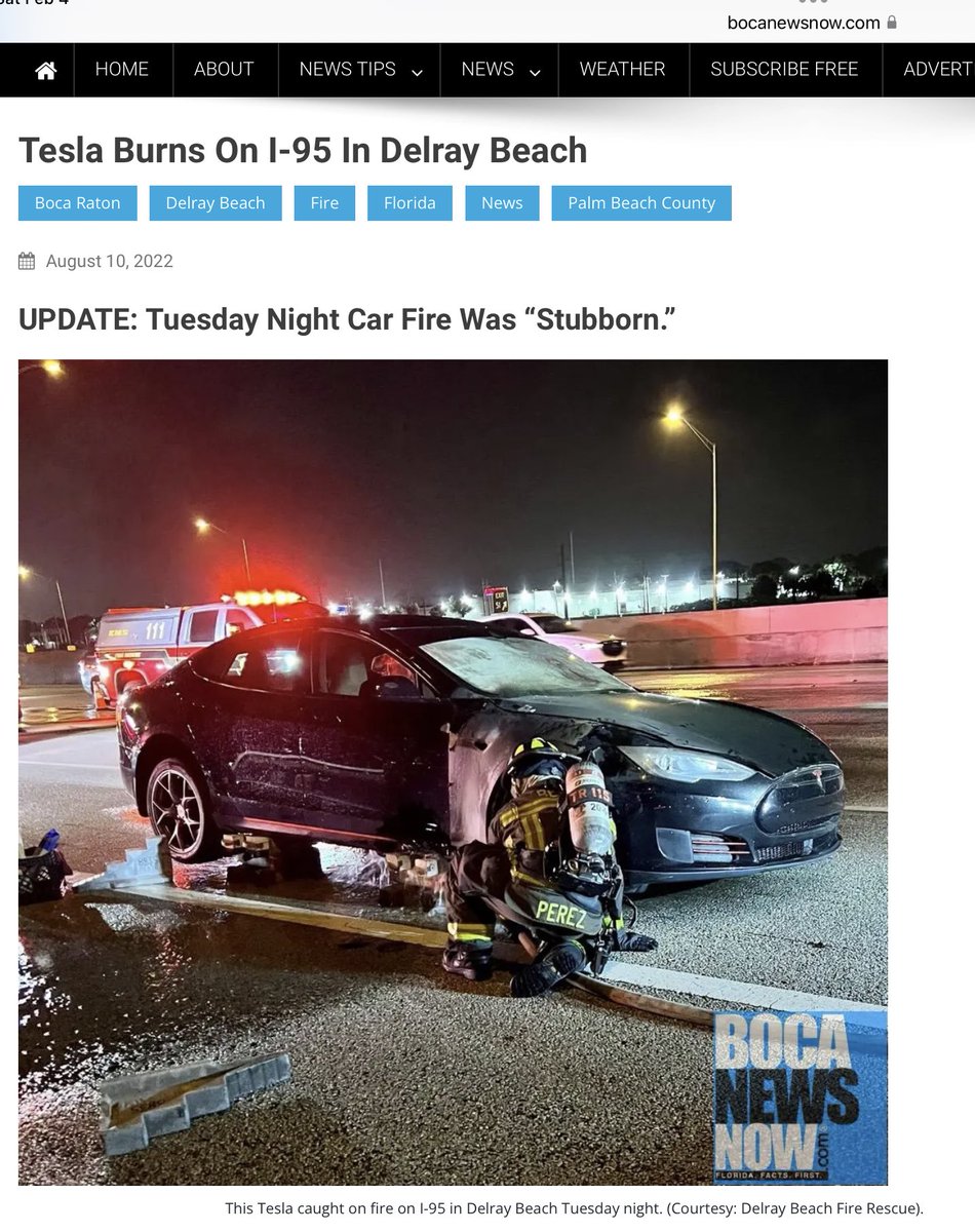 No media follow up on this “spontaneous Tesla fire” in Delray Beach, Florida, which shut down traffic on a busy highway, exposing commuters and residents nearby to toxic flames for hours. The car repeatedly rekindled as fire fighters struggled to put it out.