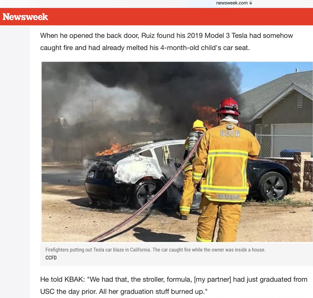 Meanwhile back in California, Ediel Ruiz was celebrating his partner’s graduation from USC, when his Tesla Model 3 parked outside decided to spontaneously set itself on fire, burning partner’s “graduation stuff” and his child’s car seat, while emitting toxic hydrogen cyanide.