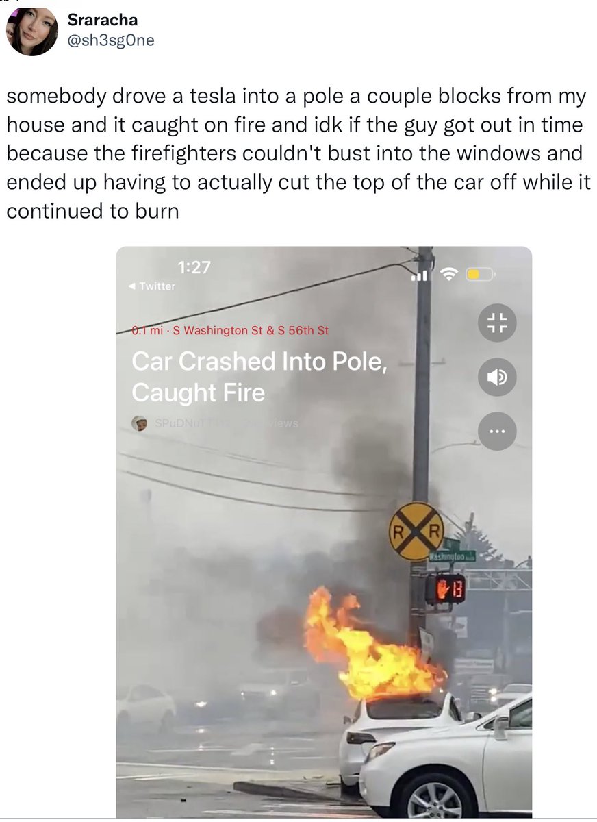 This was one of 30 Tesla fires reported in 2021, a jump from 7 🔥 reported in 2020. In 2022, Tesla fires doubled to nearly 60 (averaging more than one fire per week).