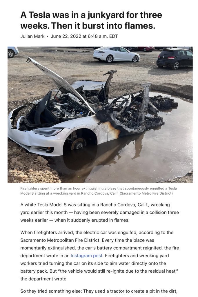 It took 6000 gallons of water to contain this Tesla fire that exposed the vehicle owners, first responders, passers by and residents of nearby communities to toxic fumes. Tesla should be penalized $10,000,000 for each “spontaneous” vehicle fire.