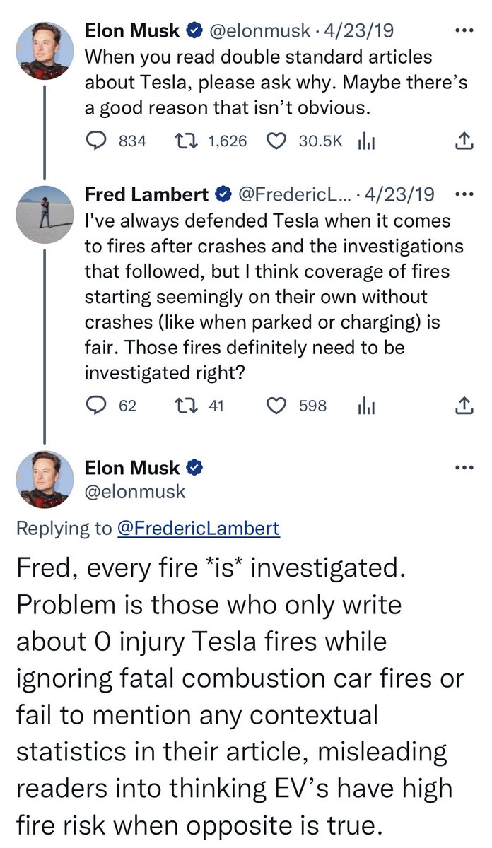 This exchange is from 2019. As Tesla spontaneous fires come under scrutiny, expect Musk to again deflect by using misleading stats / alleging “media double standard” in coverage of Tesla fires instead of committing to publishing honest findings of what is causing these fires.