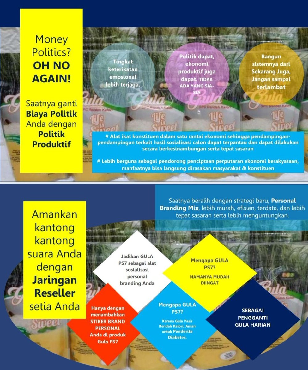 Timses Anda akan memiliki jaringan bisnis usai Pemilu. Bandingkan jika branding dgn menggunakan Stiker/T-shirt Caleg, kalender dst, yang harganya juga tidak beda dgn Gula PS7 branding Caleg; tak menjadi bisnis. Namun gula PS7 akan berlanjut(reepet order).