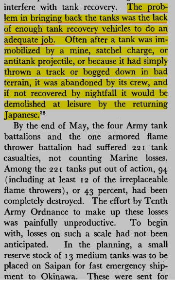 The US Army's failure to bring enough tank recovery vehicles to the April-June 1945 Battle of Okinawa crippled it's tank fleet through unnecessary & avoidable attritional losses to Japanese soldiers with satchel charges.