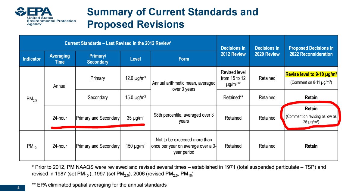 EPA's proposing to lower the annual PM2.5 std but keep the 24-hr std at 35 ug/m3 BUT they're accepting comments to revise the 24hr std down to 25 ug/m3!