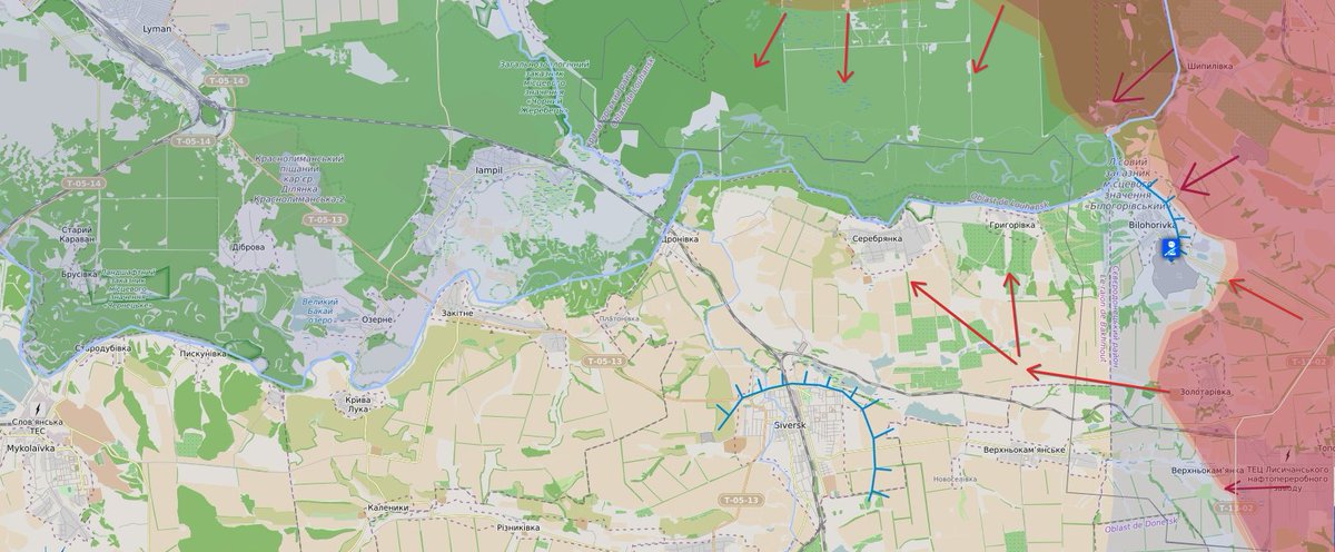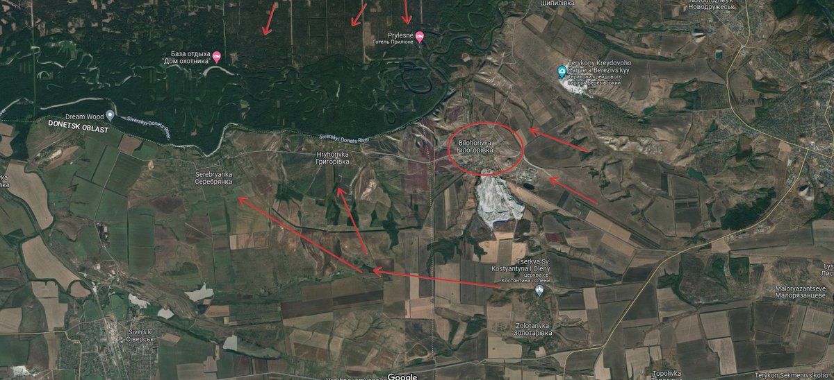 This operation is proceeding fairly rapidly as we discussed. There are conflicting reports about UA withdrawals of Bilohorivka, and the RU capture of the town. Either way, there are solid reports of attacks from the southeast towards Hryhorivka & Serebrinka as the Russian forces