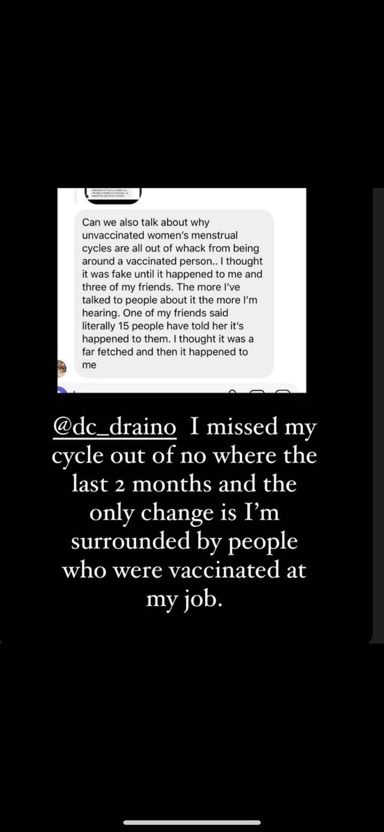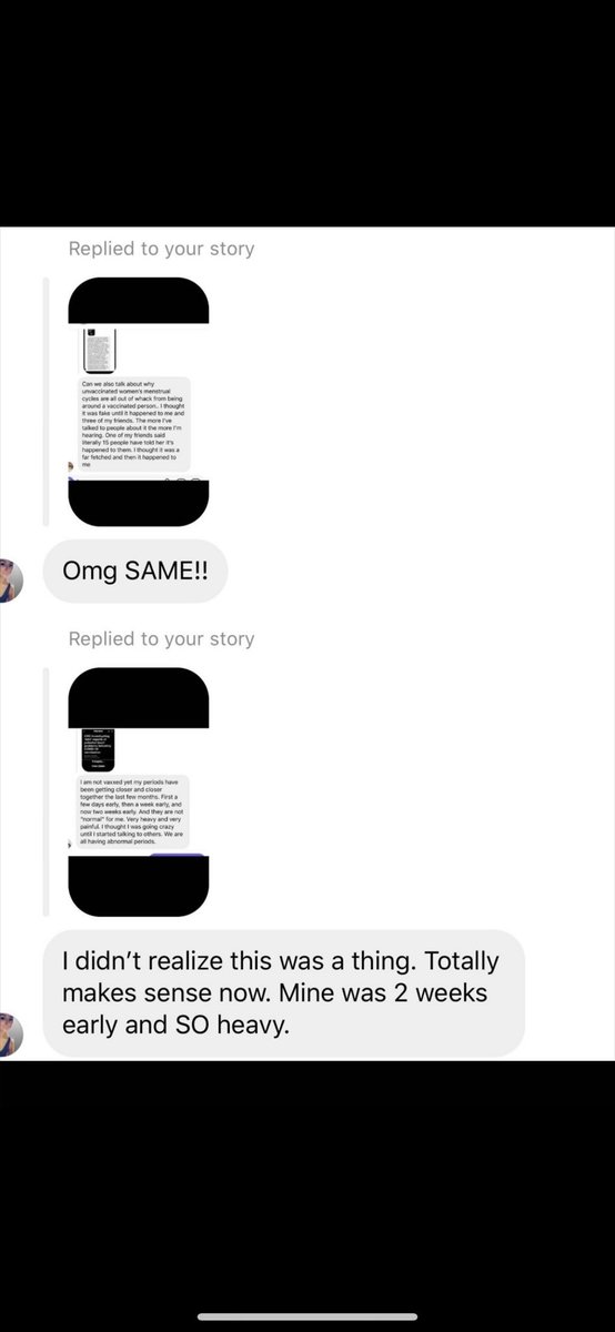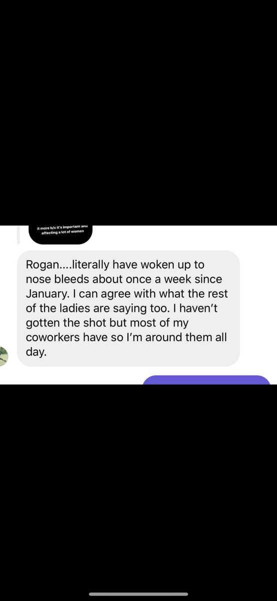 Unvaccinated women said they were getting multiple periods, extremely painful periods, abnormally heavy flows, and nose bleeds after multiple people around them at work got vaccinated