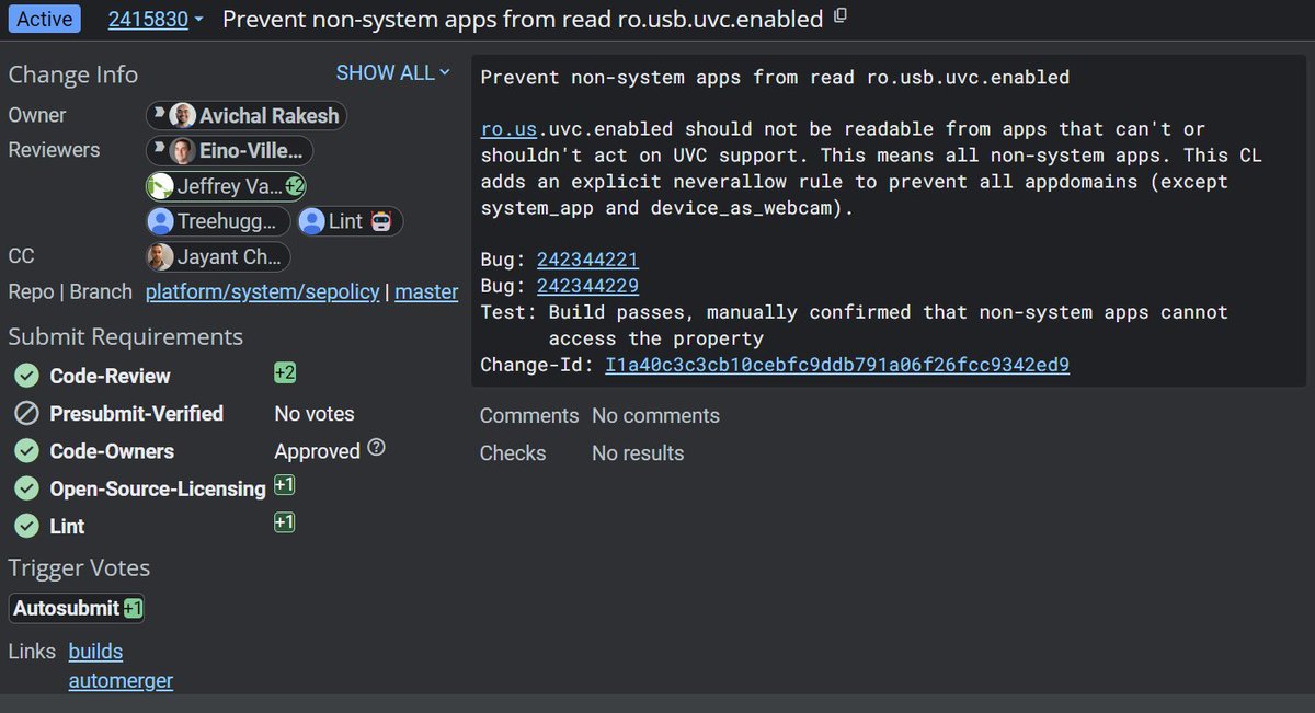 The system property 'ro.usb.uvc.enabled' will be used to toggle UVC gadget functionality on Android devices. It's only readable by system apps, and specifically the Settings app and USB gadget HAL will read it.