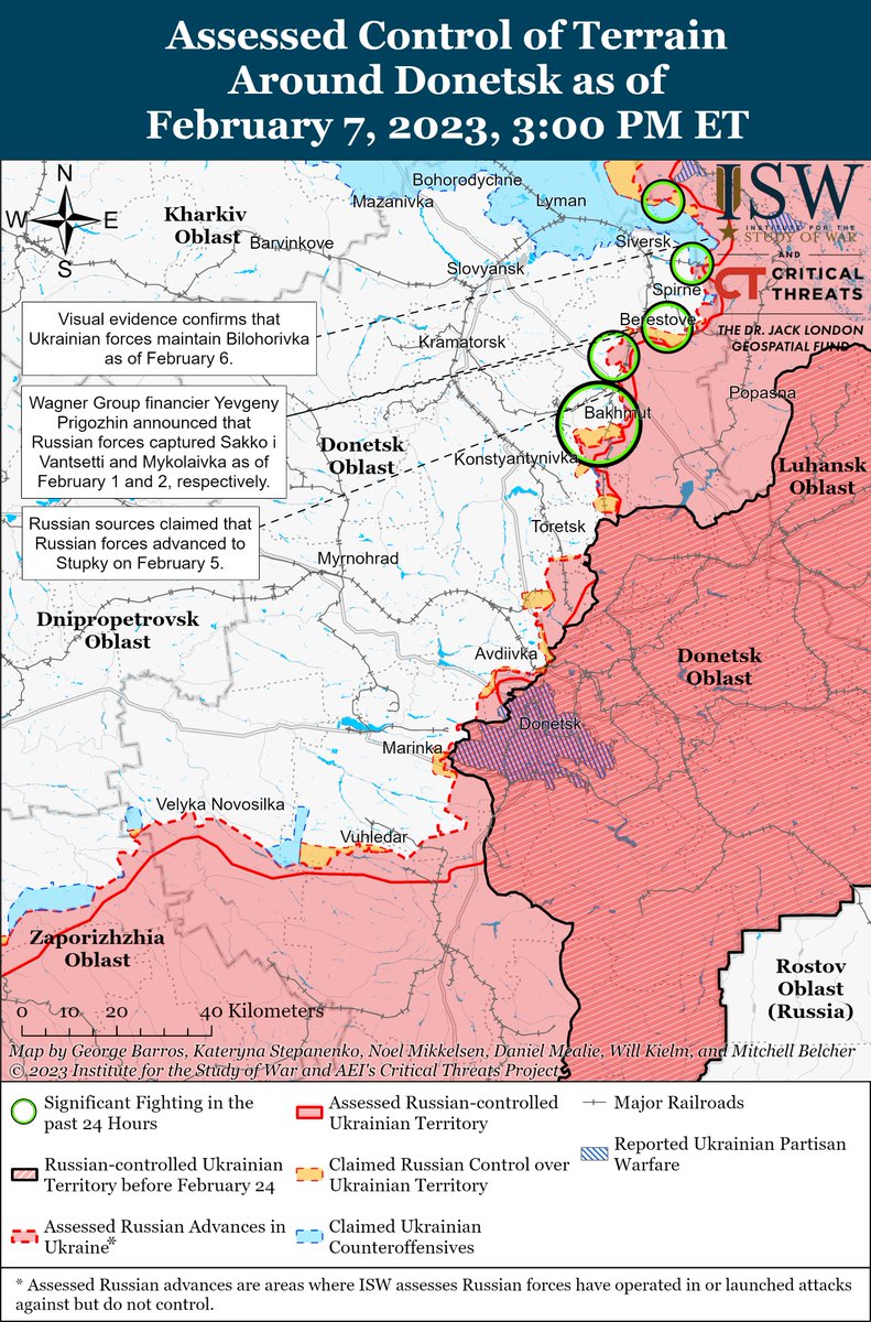 #Donetsk: Russian forces continued ground attacks around #Bakhmut on February 7. Geolocated footage published on February 6 confirms Russian tactical advances north of Bakhmut near Blahodatne (7km north of Bakhmut) and Krasna Hora (7km north of Bakhmut). isw.pub/UkrWar020723
