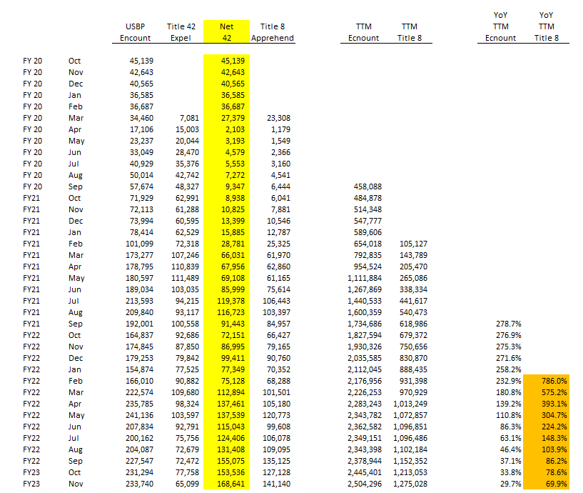 Title 42 SCOTUS is a sideshow. It will go away but POTUS pivot away from 42 already in progress. Title 42 down to 30.7% of encounters on SW border vs. 60+ at peak. 42 = Expelled, while 8 = US Custody (ie $GEO or $CXW)