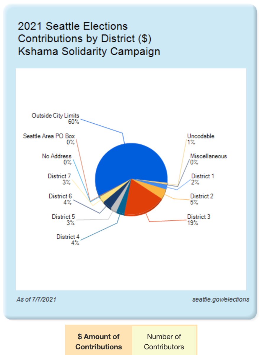 What's more, the MAJORITY of funds -- an astonishing 60% of the funds to keep her in office -- come from OUTSIDE THE CITY OF SEATTLE.