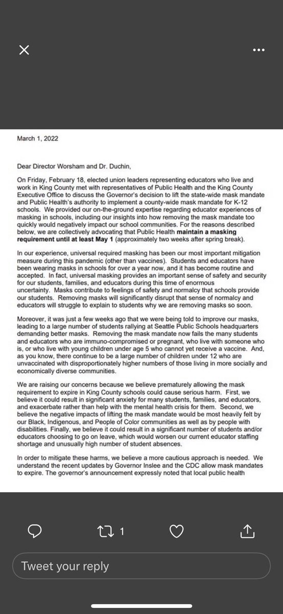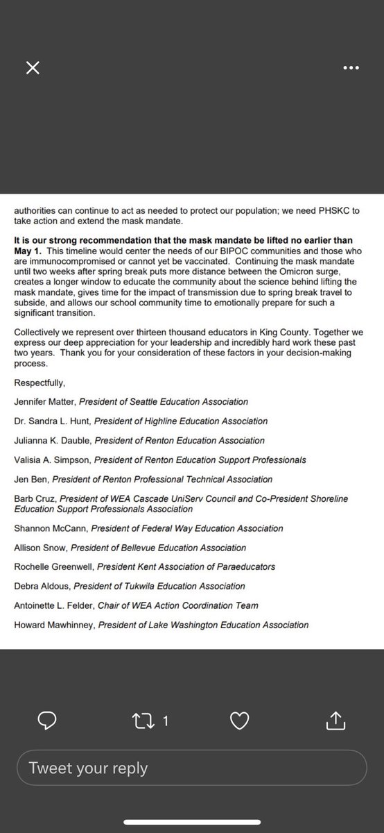 Seattle Teachers Union letter, advocating to keep all 56,000 K-12th graders masked until “at least May 1st.” This despite @CDC and state department of health guidelines. They don’t cite a single study which shows that mask mandates change outcomes. Follow the science, or nah?