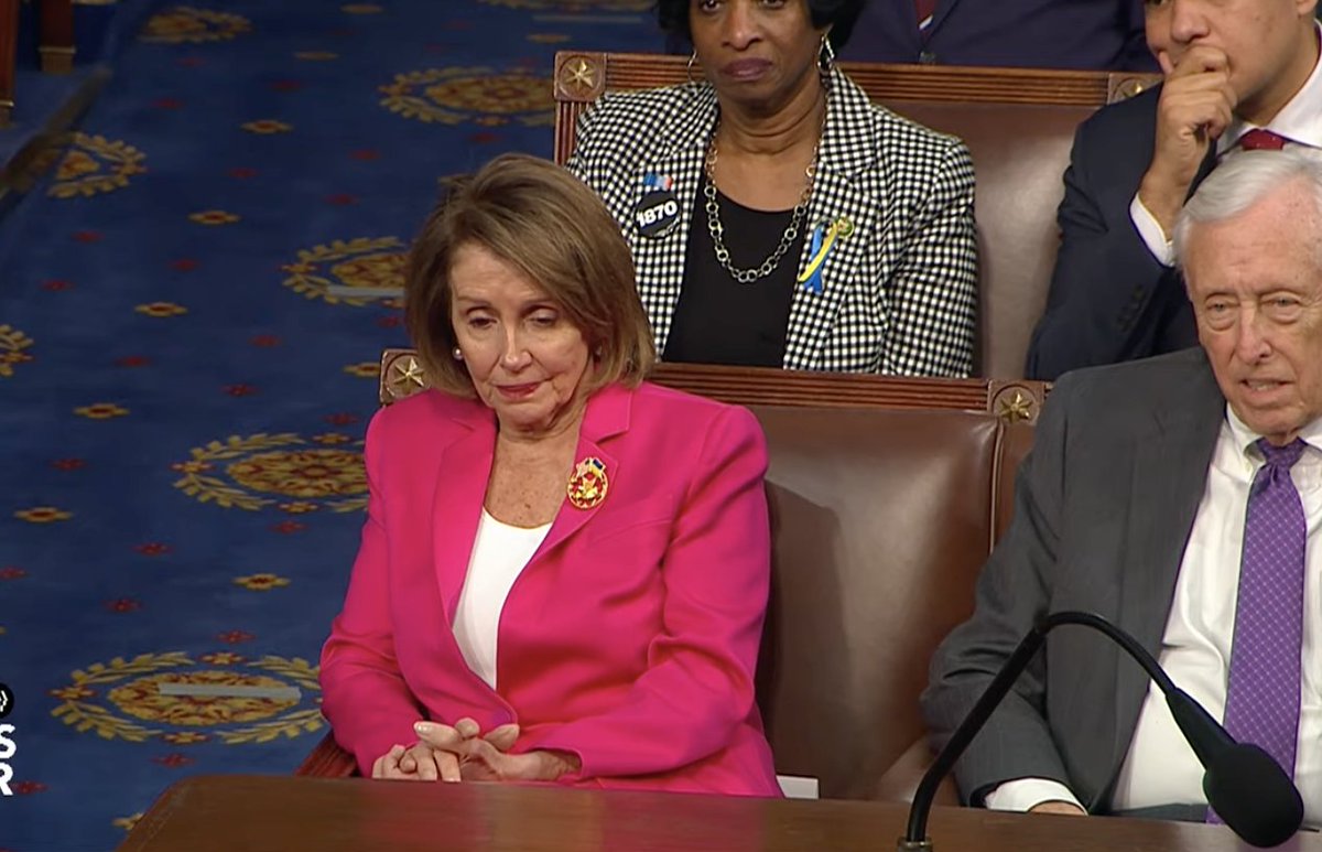 Camera pans to Nancy Pelosi as the chamber applauds the resilience of her husband.