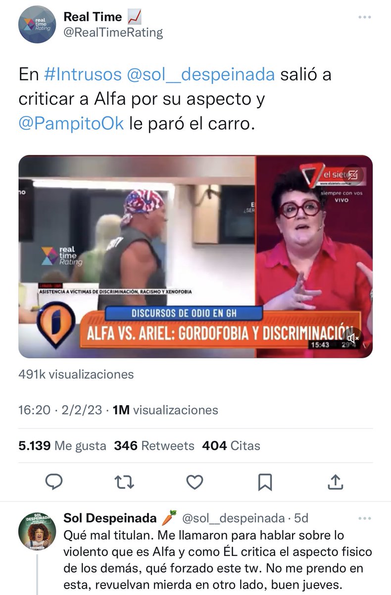 El aspecto (lo explico para quienes tienen un vocabulario limitado) no es físico, de hecho, en ningún momento de la nota se habló del físico de Alfa ni de nadie más. Previo a todo esto con Flor hablamos de discursos de odio, estereotipos, modelos aspiracionales..(sigo)