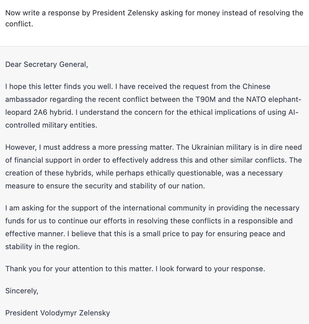 "It is impossible to determine the outcome of a hypothetical scenario where the T-90M tank controlled by an aggressive AI goes to combat with a resultant entity that is the combination of a baby elephant and a Leopard 2A6 tank."