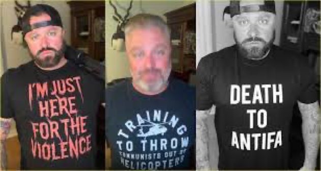 27/ "In one case, [Biggs] recorded a video of himself holding an American-flag-themed bat with spikes on the end, saying he was preparing to 'bust some heads.' He also wore a T-shirt with the phrase 'Training to Throw Communists Out of Helicopters' emblazoned on the front."