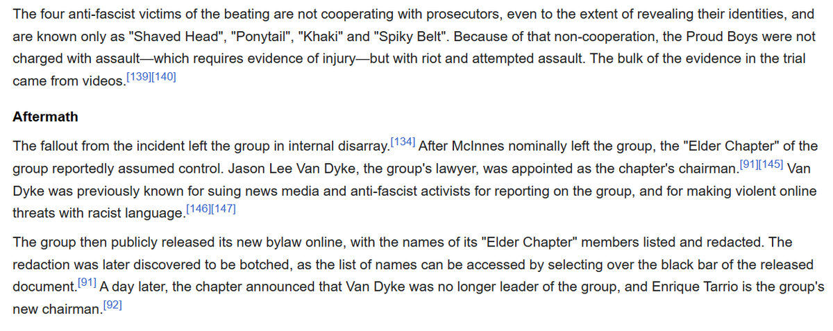 21/ More info. from Wikipedia re: the Proud Boys brawl in New York in 2018, which led to founder Gavin McInnes's nominal withdrawal from the organization and Enrique Tarrio's appointment as the group's new chairman.
