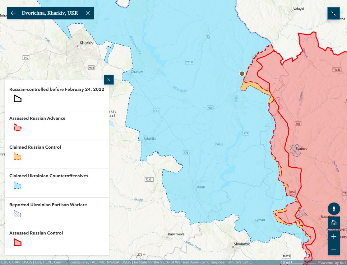 The Russian Ministry of Defense (MoD) claimed that Russian forces completely captured Dvorichne, #Kharkiv Oblast (53km northwest of Svatove), although @TheStudyofWar has not observed visual confirmation of this claim.