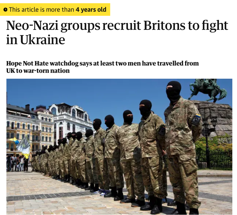 Here's the Guardian, for example, pointing out nearly five years ago that neo-Nazi groups in Ukraine were recruiting Britons to attack Russian-speaking communities in the Donbas – another part of the story now erased by the western media from Ukraine's history