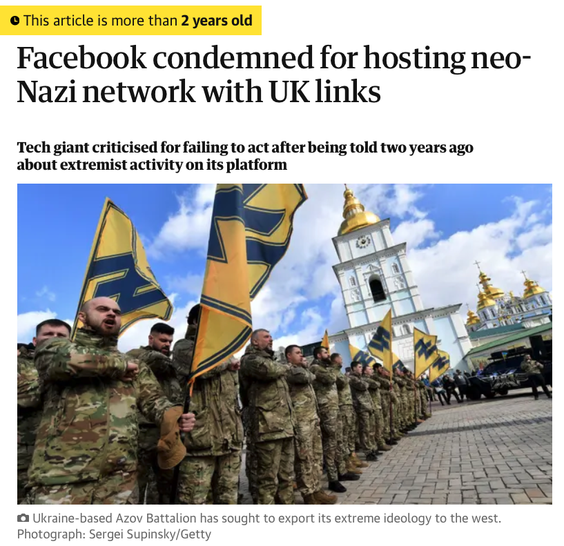 And here two years ago is the Guardian joining the attacks on Facebook for not doing more to crack down on neo-Nazi groups, including two it identifies in Ukraine. It even uses a photo of Ukraine's neo-Nazi Azov Battalion to illustrate the article