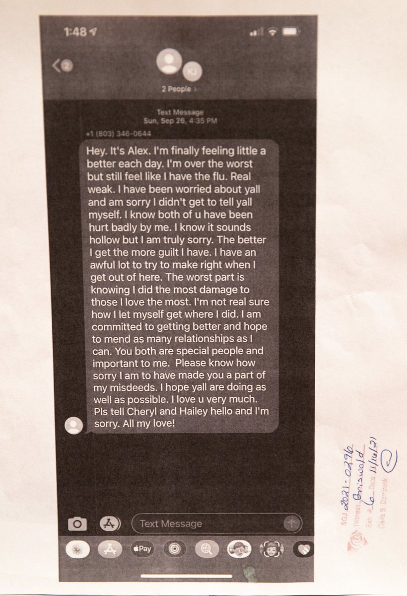 @WhitakerPhotos@JAABPhoto 1. Alex Murdaugh has taken a stack of documents back to the jail with him every night. Seems to play an active role in his own defense. 2. The 9/26/21 text Murdaugh sent to his paralegal and assistant as his life unraveled 3. A spreadsheet of data gleaned from Murdaugh's Suburban