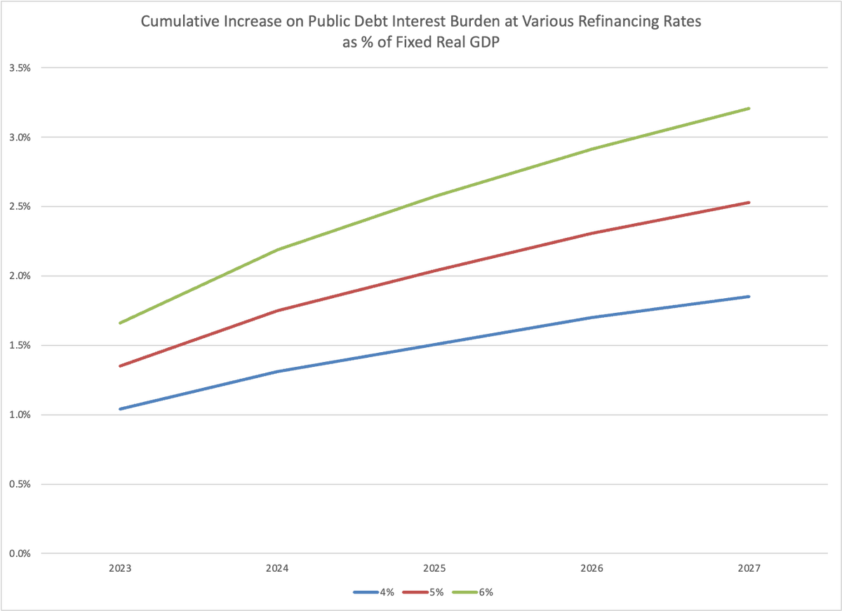 I've now looked at all public debt at the cusip level and reviewed how the interest burden on the US taxpayer will evolve assuming various refinancing rates. The FUD purveyors on this site overstated the impact. At 5% refi for 5 years the annual burden increases by 600BN /yr